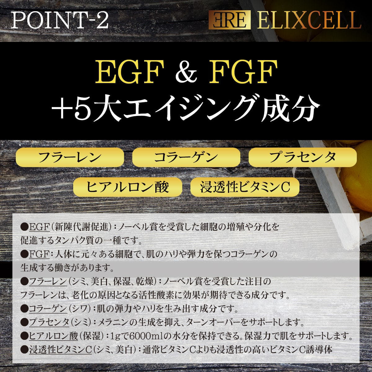 フラーレン、コラーゲン、プラセンタ、ヒアルロン酸、浸透性ペプチドビタミンC誘導体、加水分解卵殻膜、ハス花エキス、ニンフェアケルレア花エキス