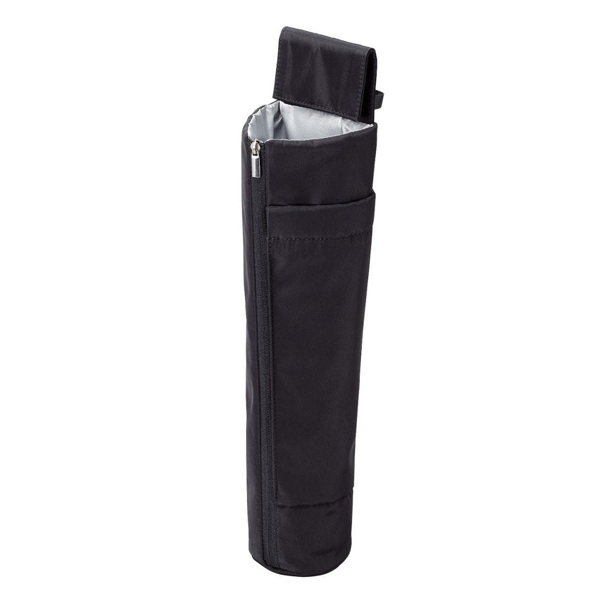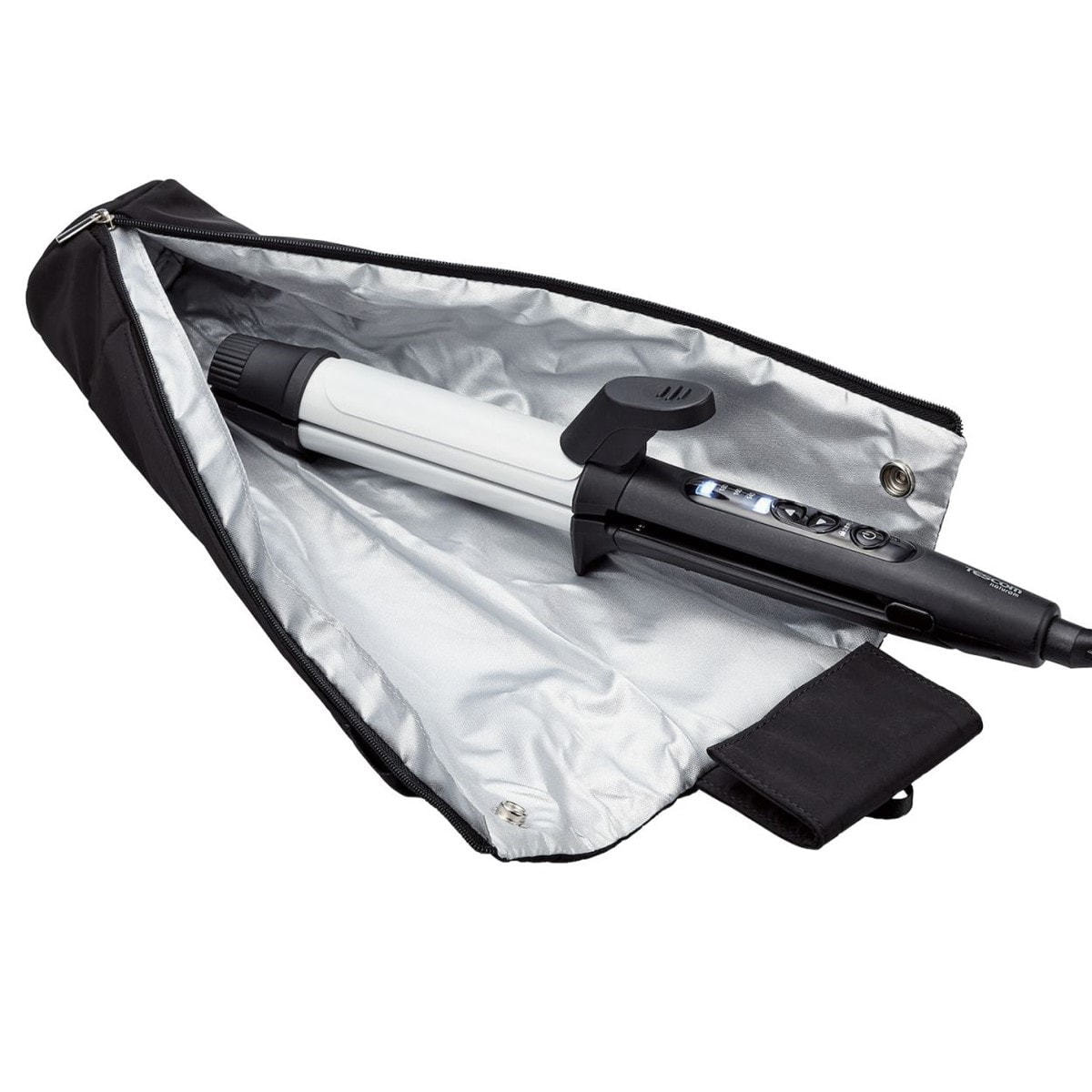 ■取り出し口のスナップボタンを留めるとヘアアイロンの飛び出しを防ぎます。旅行などの持ち運びの際も安心です。
