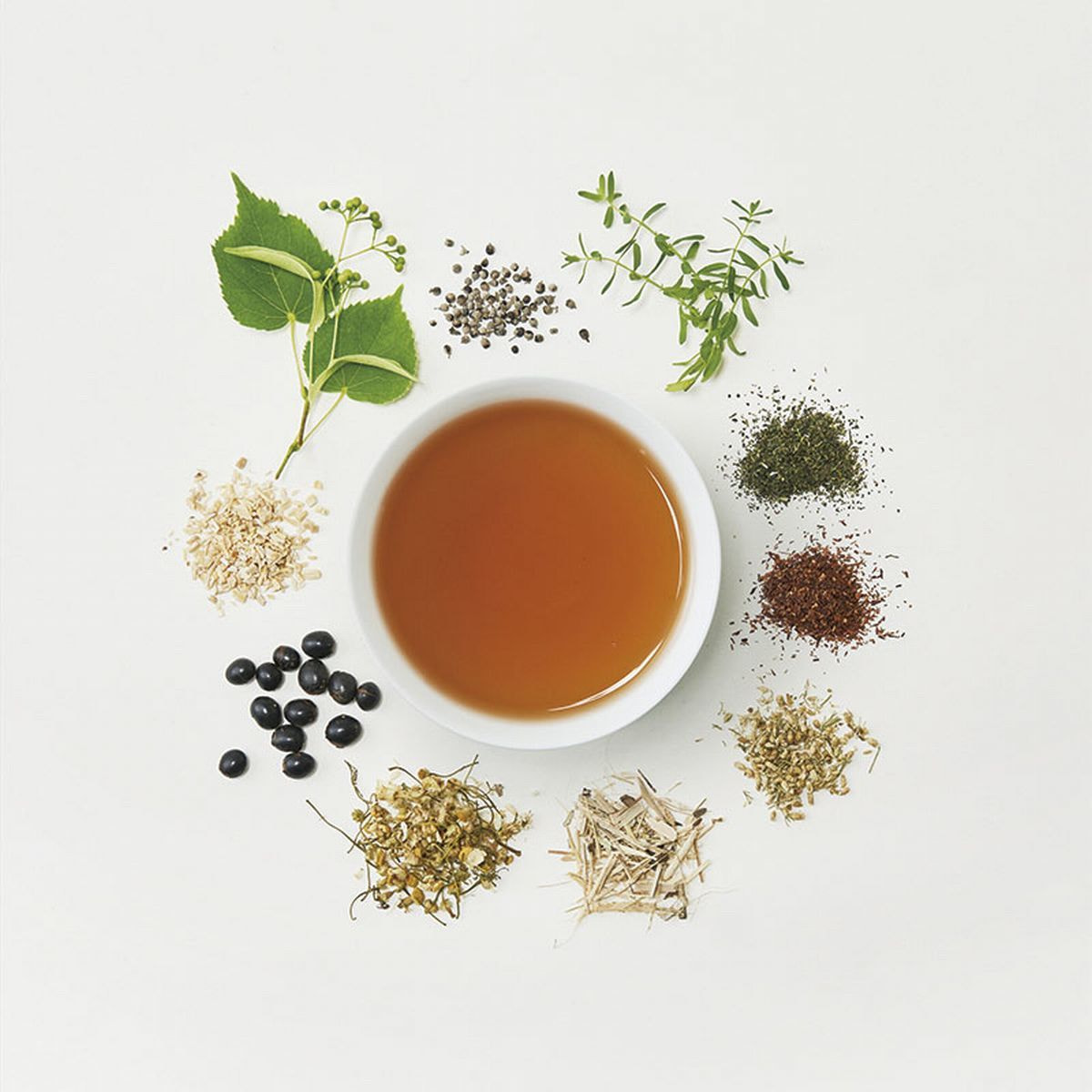 黒大豆(国産)、ルイボスレッド、シベリアンジンセン、レディースマントル、シャタバリ、セントジョンズワート、リンデンフラワー、西洋ニンジンボク、カモマイルジャーマン、ヤロウ、セージ、ローズヒップ、ネトル